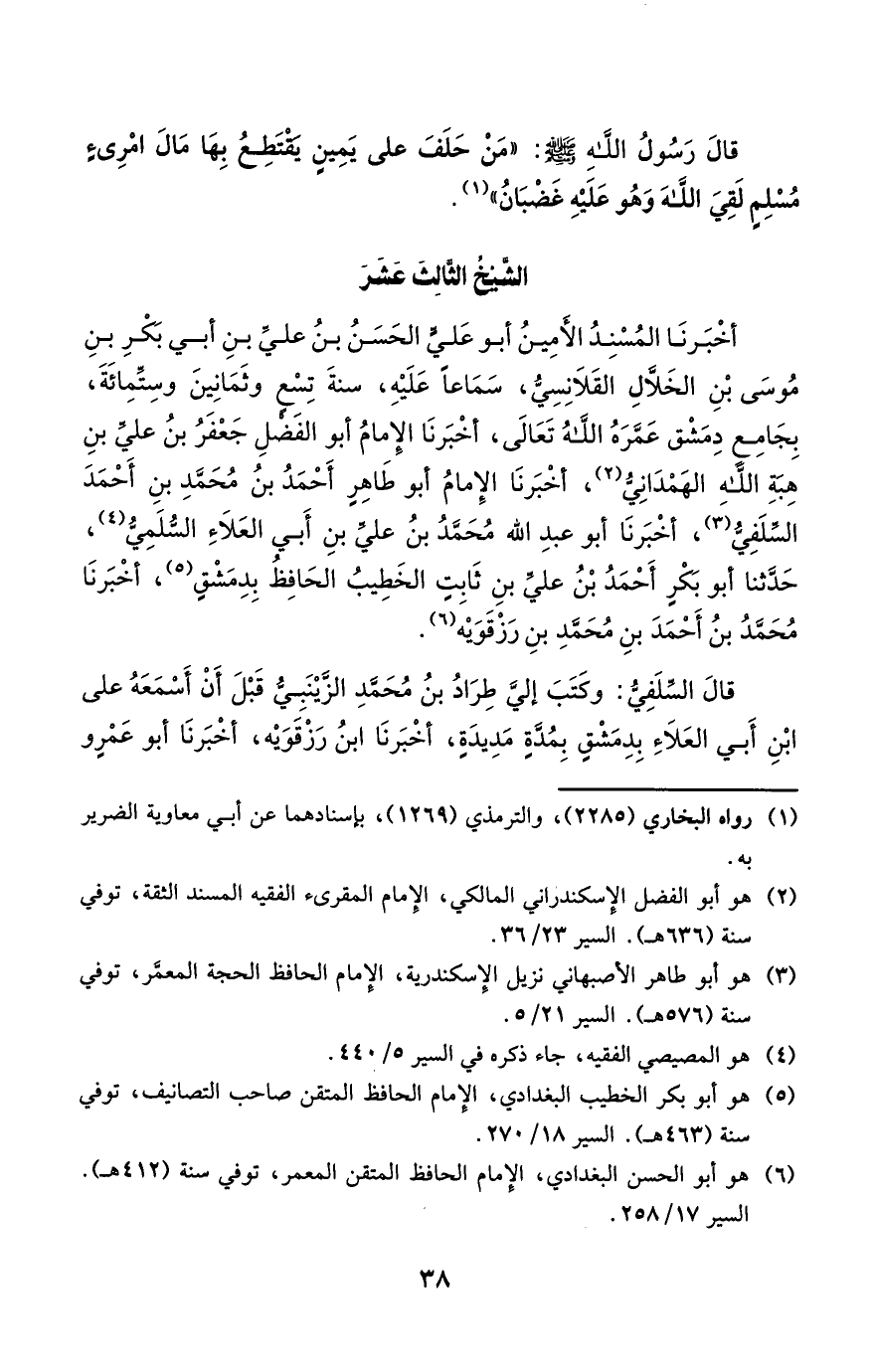 أخبرنا المسند الأمين أبو علي الحسن بن علي بن أبي بكر بن موسى بن الخلال القلانسي، سماعاً عليه، سنة تسع وثمانين وستمائة، بجامع دمشق عمره الله تعالى، أخبرنا الإمام أبو الفضل جعفر بن علي بن هبة الله الهمداني، أخبرنا الإمام أبو طاهر أحمد بن محمد بن أحمد السلفي، أخبرنا أبو عبد الله محمد بن علي بن أبي العلاء السلمي، حدثنا أبو بكر أحمد بن علي بن ثابت الخطيب الحافظ بدمشق، أخبرنا محمد بن أحمد بن محمد بن رزقويه.