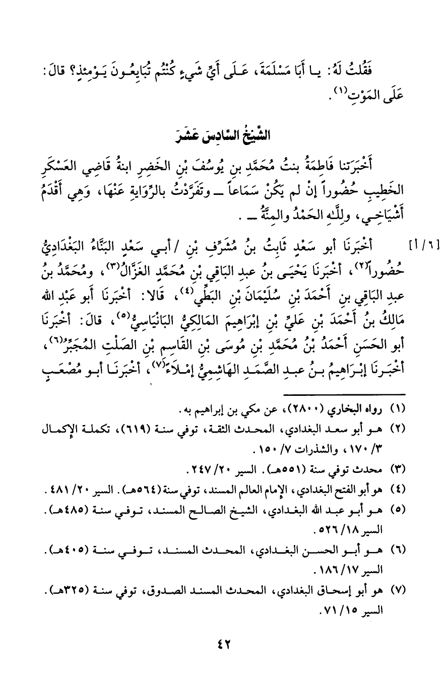 أخبرتنا فاطمة بنت محمد بن يوسف بن الخضر ابنة قاضي العسكر الخطيب حضوراً إن لم يكن سماعاً –وتفردت بالرواية عنها، وهي أقدم أشياخي، ولله الحمد والمنة-.