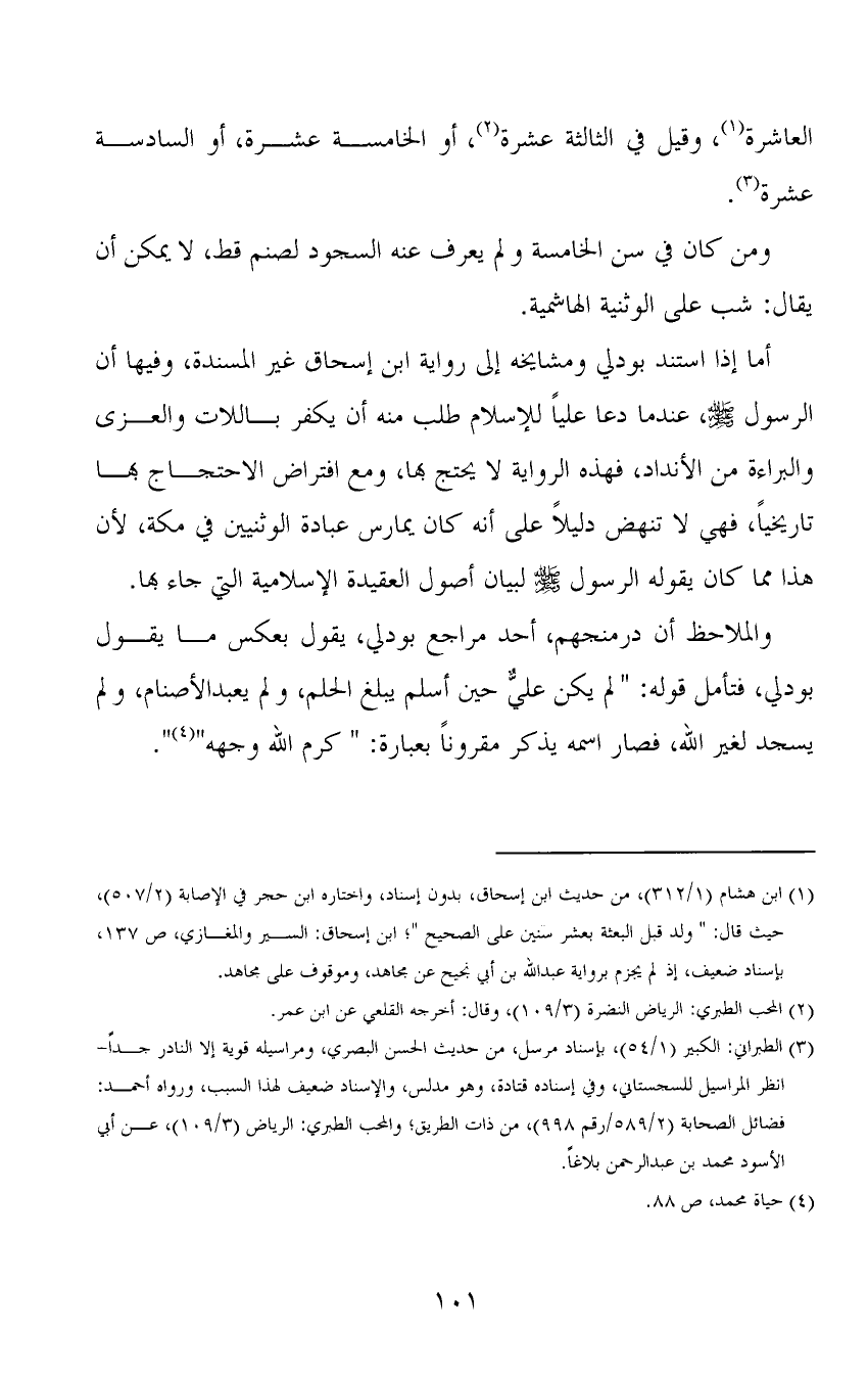 ومن كان في سن الخامسة ولم يعرف عنه السجود لصنم قط، لا يمكن أن يقال: شب على الوثنية الهاشمية.