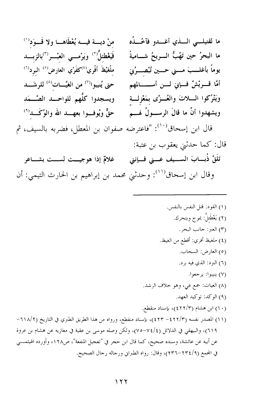 قال ابن إسحاق (10) : "فاعترضه صفوان بن المعطل، فضربه بالسيف، ثم قال: كما حدثني يعقوب بن عتبة: