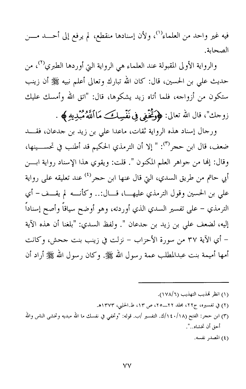 ورجال إسناد هذه الرواية ثقات، ماعدا علي بن زيد بن جدعان، فقد ضعف، قال ابن حجر (3) : " إلا أن الترمذي الحكيم قد أطنب في تحسينها، وقال: إنها من جواهر العلم المكنون ". قلت: ويقوي هذا الإسناد رواية ابن أبي حاتم من طريق السدي، التي قال عنها ابن حجر (4) عند تعليقه على رواية علي بن الحسين وقول الترمذي عليها، قال:.. وكأنه لم يقف - أي الترمذي - على تفسير السدي الذي أوردته، وهو أوضح سياقاً وأصح إسناداً إليه، لضعف علي بن زيد بن جدعان ". ولفظ السدي: "بلغنا أن هذه الآية - أي الآية 37 من سورة الأحزاب - نزلت في زينب بنت جحش، وكانت أمها أميمة بنت عبد المطلب عمة رسول الله صلى الله عليه وسلم. وكان رسول الله صلى الله عليه وسلم أراد أن