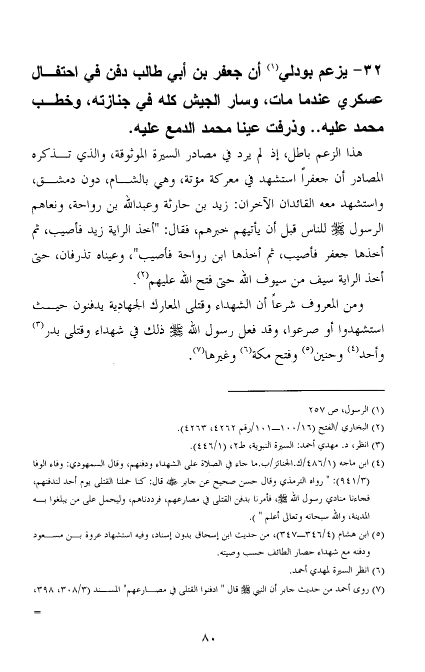 32- يزعم بودلي (1) أن جعفر بن أبي طالب دفن في احتفال عسكري عندما مات، وسار الجيش كله في جنازته، وخطب محمد عليه.. وذرفت عينا محمد الدمع عليه.