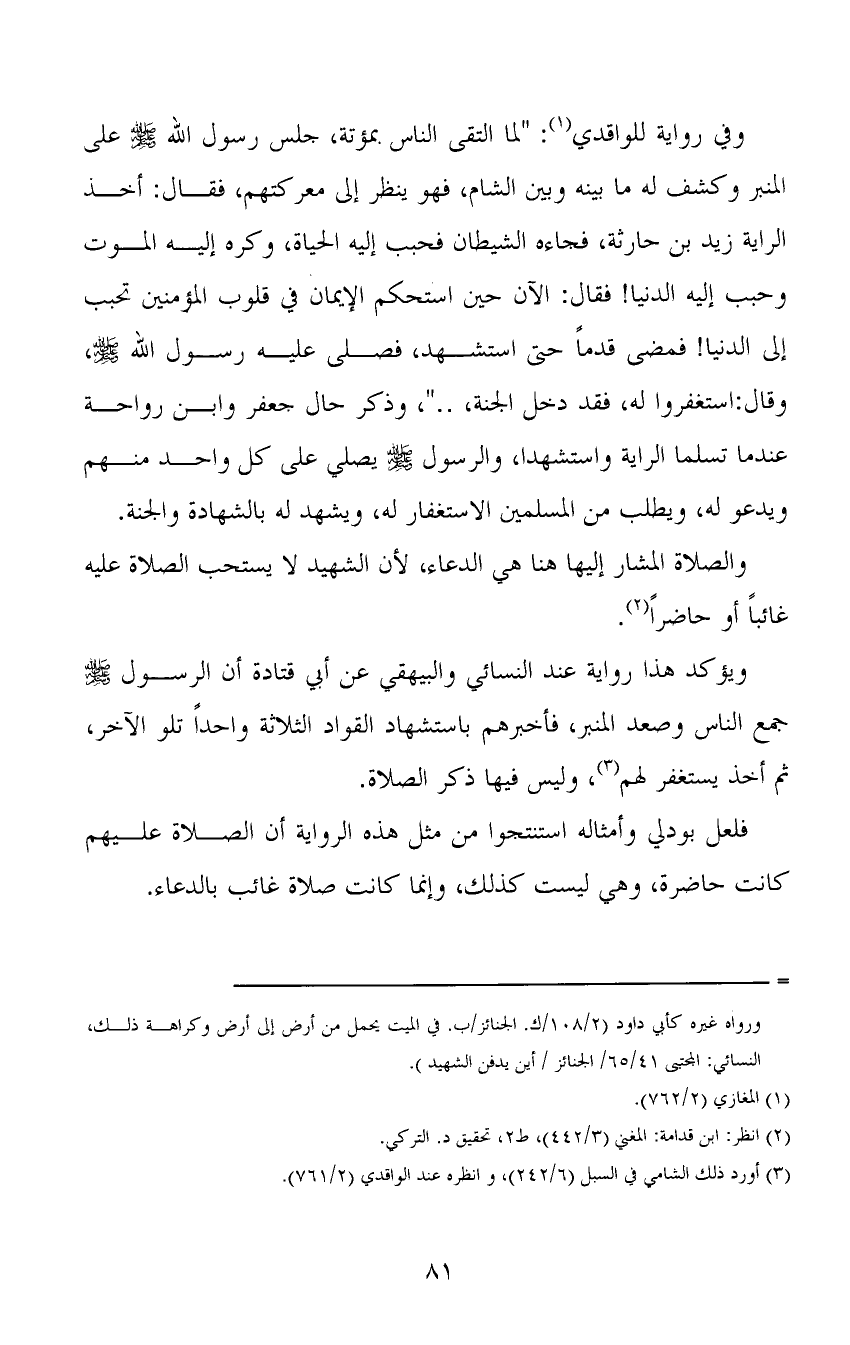 ويؤكد هذا رواية عند النسائي والبيهقي عن أبي قتادة أن الرسول صلى الله عليه وسلم جمع الناس وصعد المنبر، فأخبرهم باستشهاد القواد الثلاثة واحداً تلو الآخر، ثم أخذ يستغفر لهم (3) ، وليس فيها ذكر الصلاة.