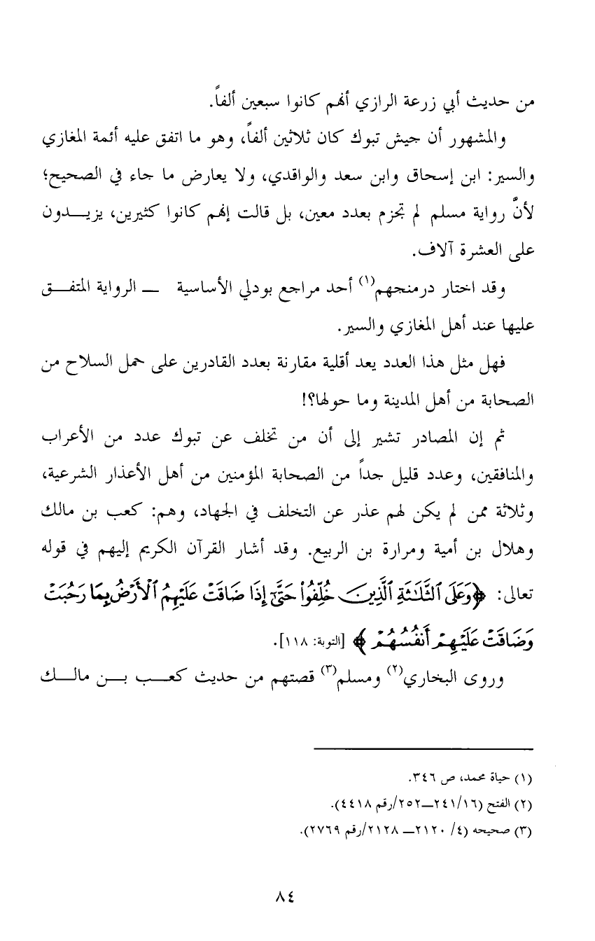 والمشهور أن جيش تبوك كان ثلاثين ألفاً، وهو ما اتفق عليه أئمة المغازي والسير: ابن إسحاق وابن سعد والواقدي، ولا يعارض ما جاء في الصحيح؛ لأنَّ رواية مسلم لم تجزم بعدد معين، بل قالت إنهم كانوا كثيرين، يزيدون على العشرة آلاف.