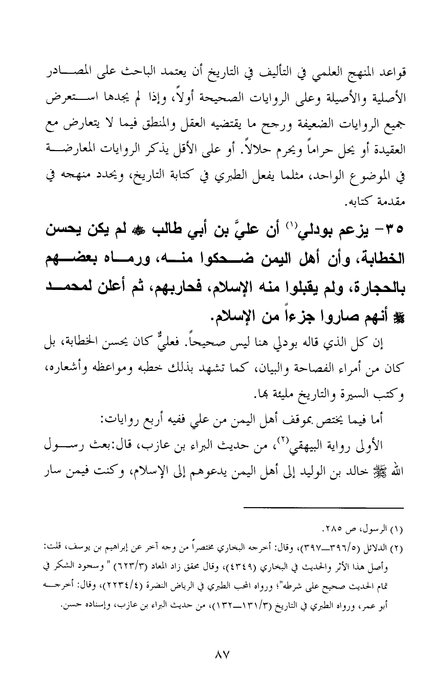 35- يزعم بودلي (1) أن عليَّ بن أبي طالب رضي الله عنه لم يكن يحسن الخطابة، وأن أهل اليمن ضحكوا منه، ورماه بعضهم بالحجارة، ولم يقبلوا منه الإسلام، فحاربهم، ثم أعلن لمحمد صلى الله عليه وسلم أنهم صاروا جزءاً من الإسلام.