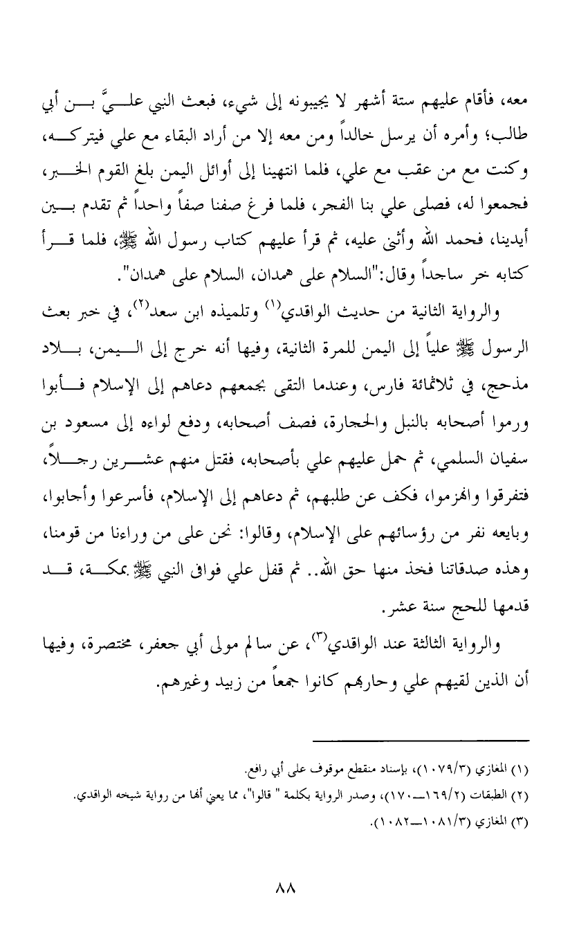 والرواية الثانية من حديث الواقدي (1) وتلميذه ابن سعد (2) ، في خبر بعث الرسول صلى الله عليه وسلم علياً إلى اليمن للمرة الثانية، وفيها أنه خرج إلى اليمن، بلاد مذحج، في ثلاثمائة فارس، وعندما التقى بجمعهم دعاهم إلى الإسلام فأبوا ورموا أصحابه بالنبل والحجارة، فصف أصحابه، ودفع لواءه إلى مسعود بن سفيان السلمي، ثم حمل عليهم علي بأصحابه، فقتل منهم عشرين رجلاً، فتفرقوا وانهزموا، فكف عن طلبهم، ثم دعاهم إلى الإسلام، فأسرعوا وأجابوا، وبايعه نفر من رؤسائهم على الإسلام، وقالوا: نحن على من وراءنا من قومنا، وهذه صدقاتنا فخذ منها حق الله.. ثم قفل علي فوافى النبي صلى الله عليه وسلم بمكة، قد قدمها للحج سنة عشر.