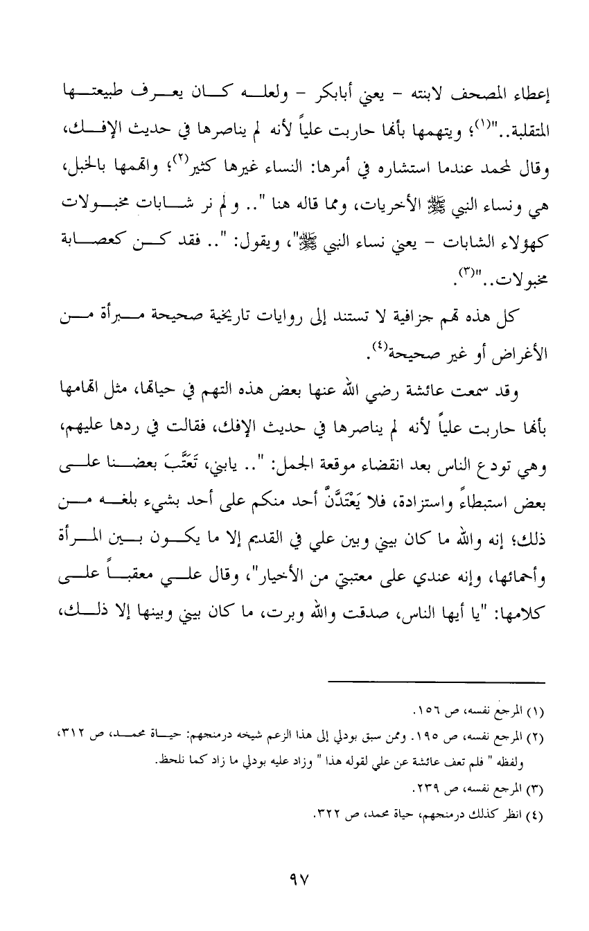 (2) المرجع نفسه، ص 195. وممن سبق بودلي إلى هذا الزعم شيخه درمنجهم: حياة محمد، ص 312، ولفظه " فلم تعف عائشة عن علي لقوله هذا " وزاد عليه بودلي ما زاد كما نلحظ.
