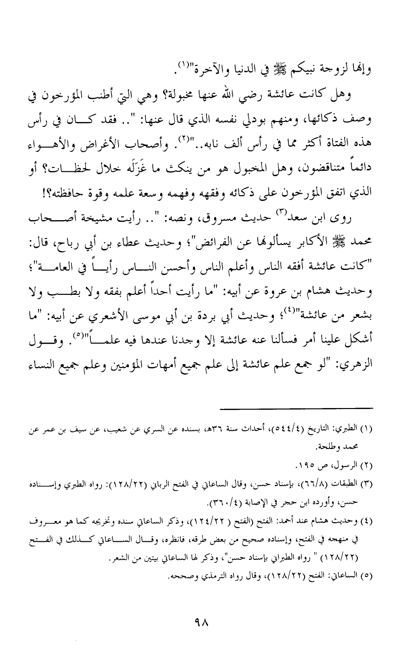 وهل كانت عائشة رضي الله عنها مخبولة؟ وهي التي أطنب المؤرخون في وصف ذكائها، ومنهم بودلي نفسه الذي قال عنها: ".. فقد كان في رأس هذه الفتاة أكثر مما في رأس ألف نابه.." (2) . وأصحاب الأغراض والأهواء دائماً متناقضون، وهل المخبول هو من ينكث ما غَزَلَه خلال لحظات؟ أو الذي اتفق المؤرخون على ذكائه وفقهه وفهمه وسعة علمه وقوة حافظته؟!