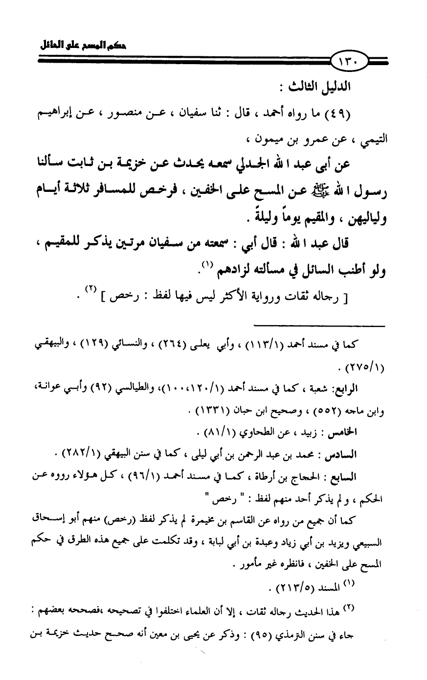 عن أبى عبد الله الجدلي سمعه يحدث عن خزيمة بن ثابت سألنا رسول الله - صلى الله عليه وسلم - عن المسح على الخفين، فرخص للمسافر ثلاثة أيام ولياليهن، والمقيم يوماً وليلةً.