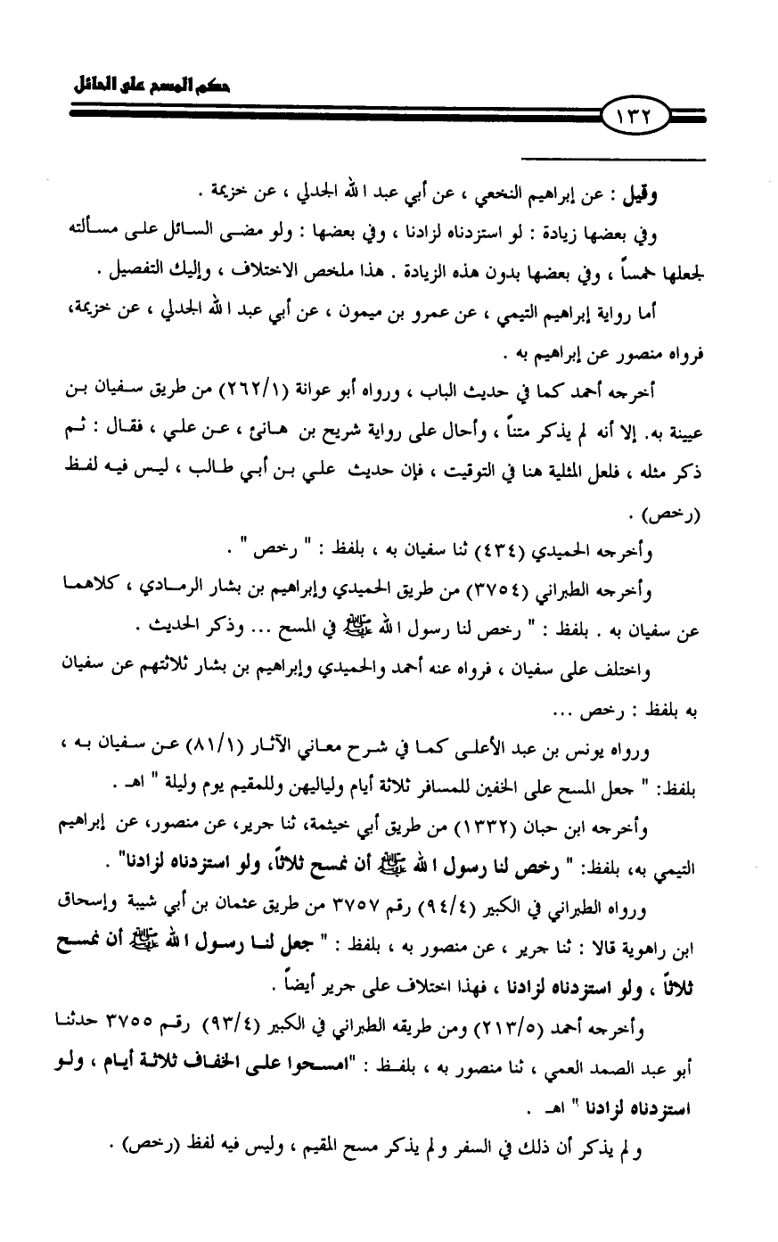 ورواه الطبراني في الكبير (٤/ ٩٤) رقم ٣٧٥٧ من طريق عثمان بن أبي شيبة وإسحاق ابن راهوية قالا: ثنا جرير، عن منصور به، بلفظ: " جعل لنا رسول الله - صلى الله عليه وسلم - أن نمسح ثلاثاً، ولو استزدناه لزادنا، فهذا اختلاف على جرير أيضاً.