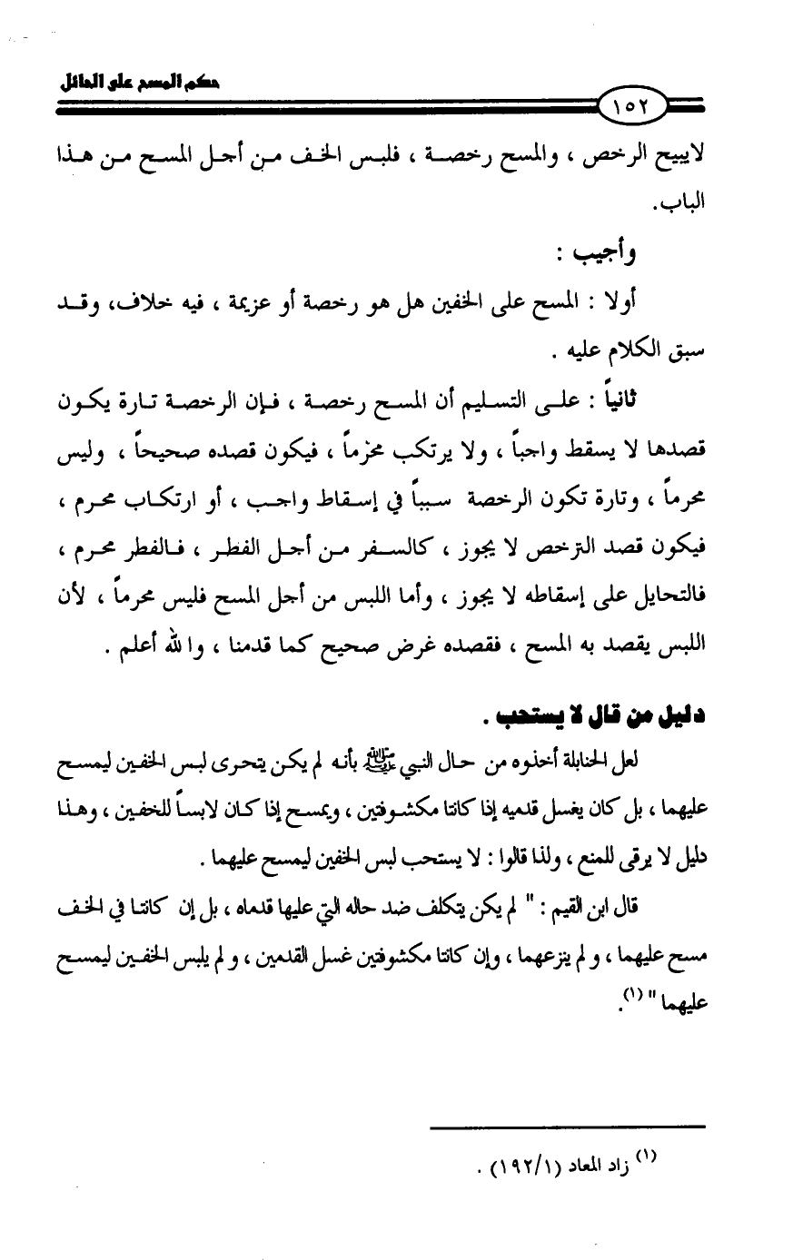 ثانياً: على التسليم أن المسح رخصة، فإن الرخصة تارة يكون قصدها لا يسقط واجباً، ولا يرتكب محرماً، فيكون قصده صحيحاً، وليس محرماً، وتارة تكون الرخصة سبباً في إسقاط واجب، أو ارتكاب محرم، فيكون قصد الترخص لا يجوز، كالسفر من أجل الفطر، فالفطر محرم، فالتحايل على إسقاطه لا يجوز، وأما اللبس من أجل المسح فليس محرماً، لأن اللبس يقصد به المسح، فقصده غرض صحيح كما قدمنا، والله أعلم.