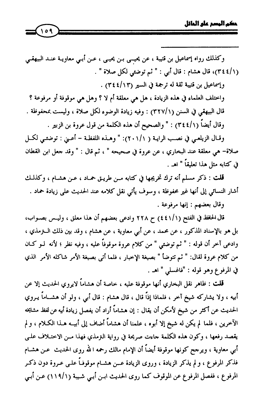 = وكذلك رواه إسماعيل بن قتيبة، عن يحيى بن يحيى، عن أبي معاوية عند البيهقي (١/ ٣٤٤)، قال هشام: قال أبي: " ثم توضئي لكل صلاة ".