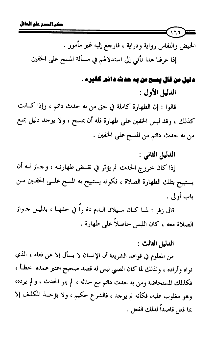 من المعلوم في قواعد الشريعة أن الإنسان لا يسأل إلا عن فعله، الذي نواه وأراده، ولذلك لما كان الصبي ليس له قصد صحيح اعتبر عمده خطأ، فكذلك المستحاضة ومن به حدث دائم مع حدثه، لم ينو الحدث، ولم يرده، وهو مغلوب عليه، فكأنه لم يوجد، فالشرع حكيم، ولا يؤخذ المكلف إلا بما فعل قاصداً لذلك الفعل.