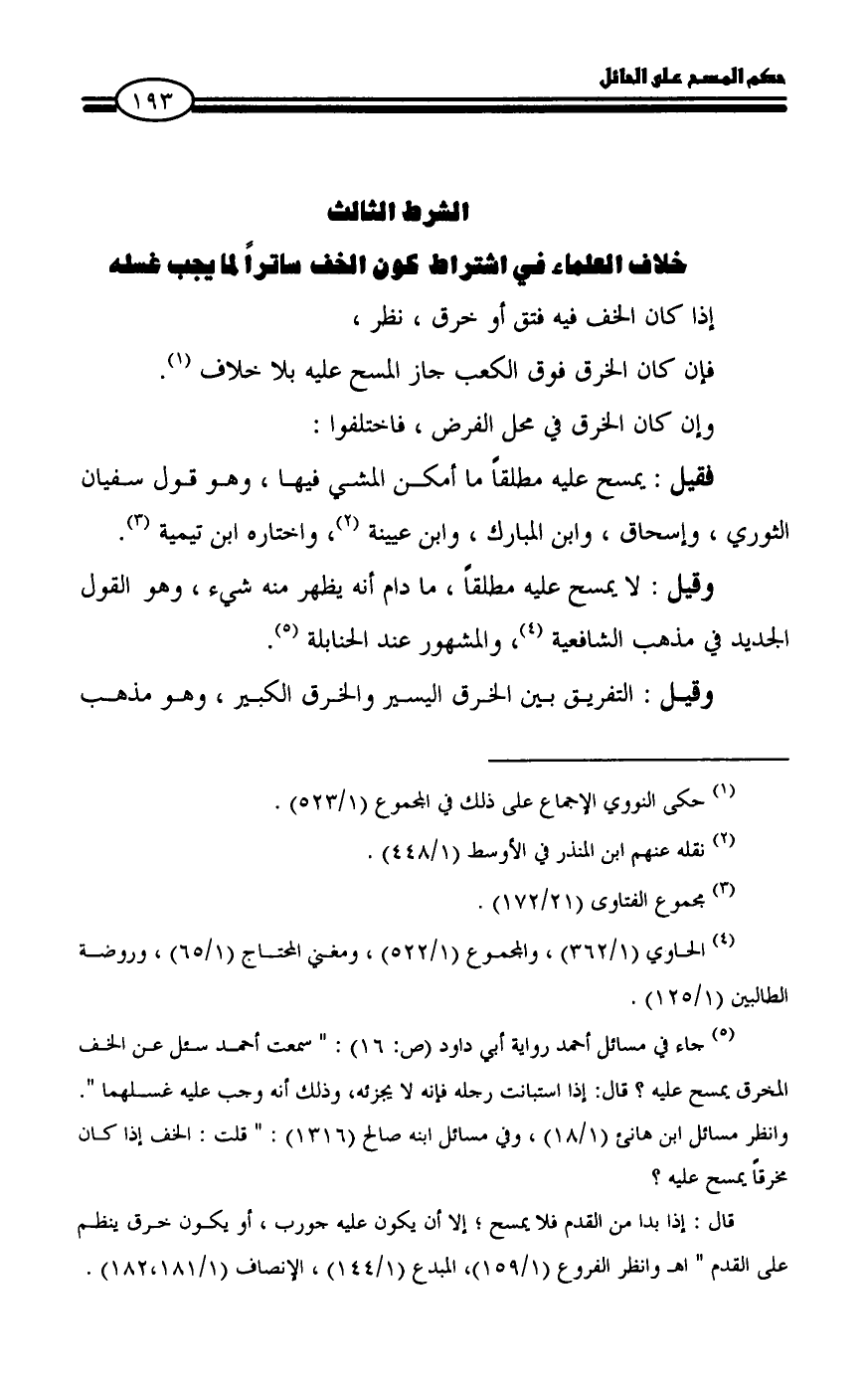 (¬٥) جاء في مسائل أحمد رواية أبي داود (ص: ١٦): " سمعت أحمد سئل عن الخف المخرق يمسح عليه؟ قال: إذا استبانت رجله فإنه لا يجزئه، وذلك أنه وجب عليه غسلهما ". وانظر مسائل ابن هانئ (١/ ١٨)، وفي مسائل ابنه صالح (١٣١٦): " قلت: الخف إذا كان مخرقاً يمسح عليه؟