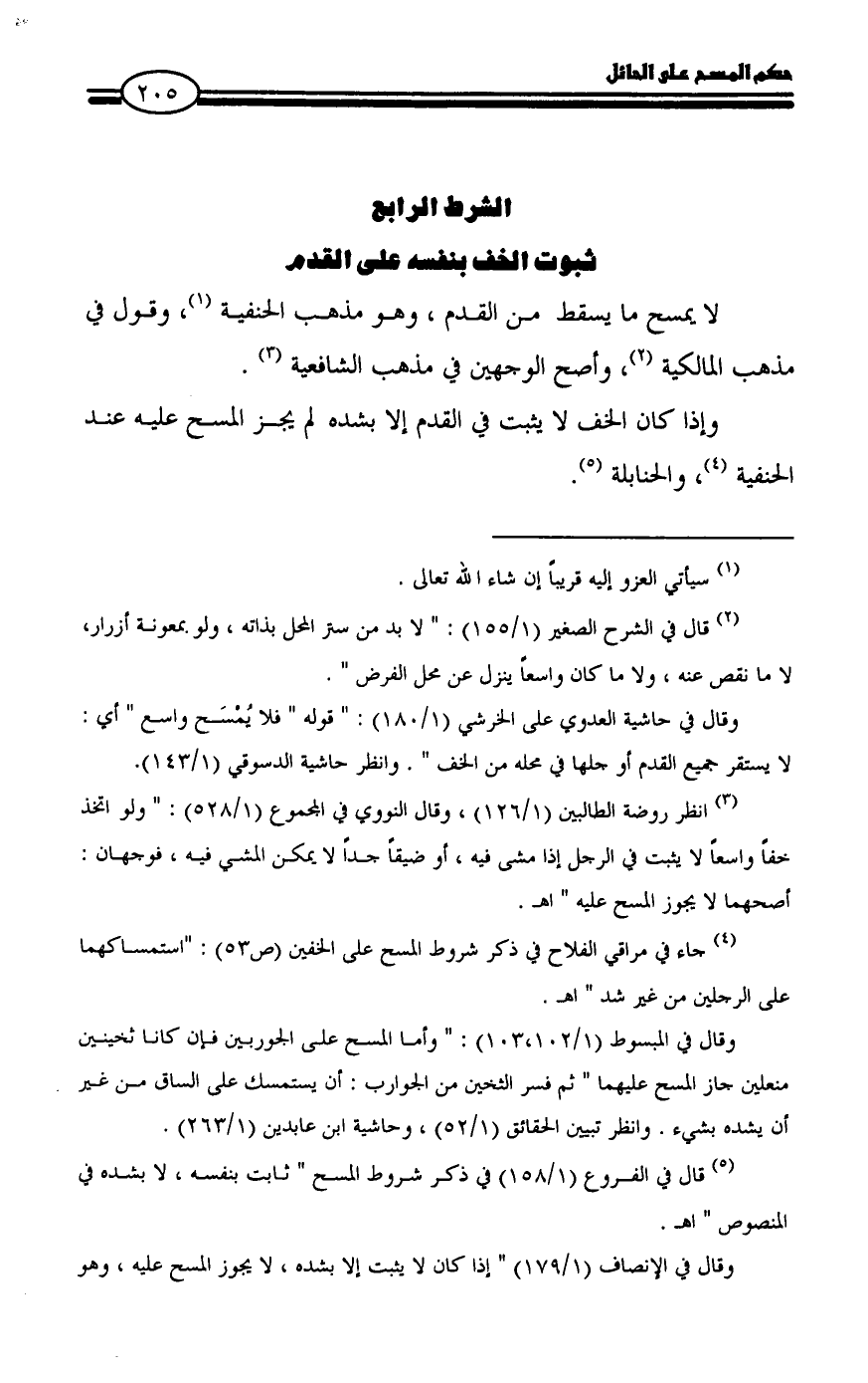 (¬٤) جاء في مراقي الفلاح في ذكر شروط المسح على الخفين (ص٥٣): "استمساكهما على الرجلين من غير شد " اهـ.