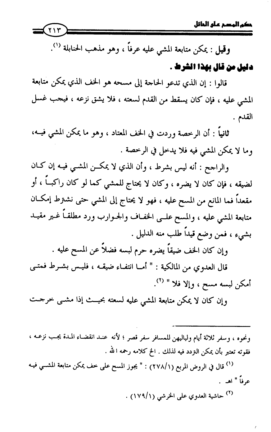 (¬١) قال في الروض المربع (١/ ٢٧٨): " يجوز المسح على خف يمكن متابعة المشي فيه عرفاً " اهـ.