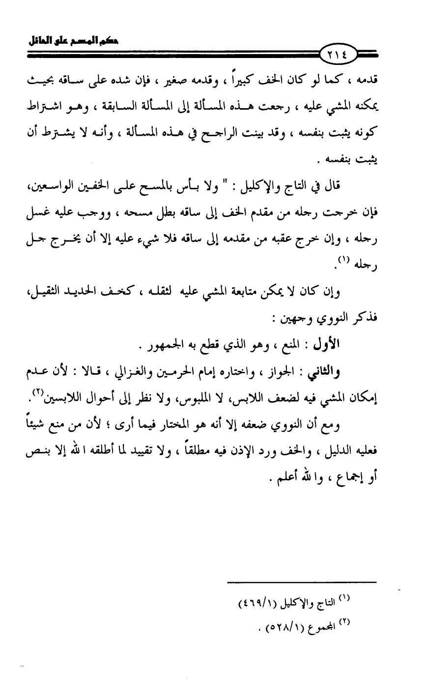 ومع أن النووي ضعفه إلا أنه هو المختار فيما أرى؛ لأن من منع شيئاً فعليه الدليل، والخف ورد الإذن فيه مطلقاً، ولا تقييد لما أطلقه الله إلا بنص أو إجماع، والله أعلم.