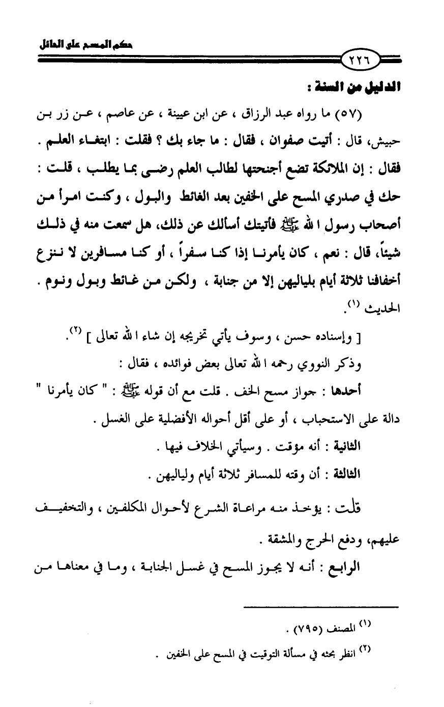(٥٧) ما رواه عبد الرزاق، عن ابن عيينة، عن عاصم، عن زر بن حبيش، قال: أتيت صفوان، فقال: ما جاء بك؟ فقلت: ابتغاء العلم. فقال: إن الملائكة تضع أجنحتها لطالب العلم رضى بما يطلب، قلت: حك في صدري المسح على الخفين بعد الغائط والبول، وكنت امرأ من أصحاب رسول الله - صلى الله عليه وسلم - فأتيتك أسألك عن ذلك، هل سمعت منه في ذلك شيئاً، قال: نعم، كان يأمرنا إذا كنا سفراً، أو كنا مسافرين لا ننزع أخفافنا ثلاثة أيام بلياليهن إلا من جنابة، ولكن من غائط وبول ونوم. الحديث (¬١).