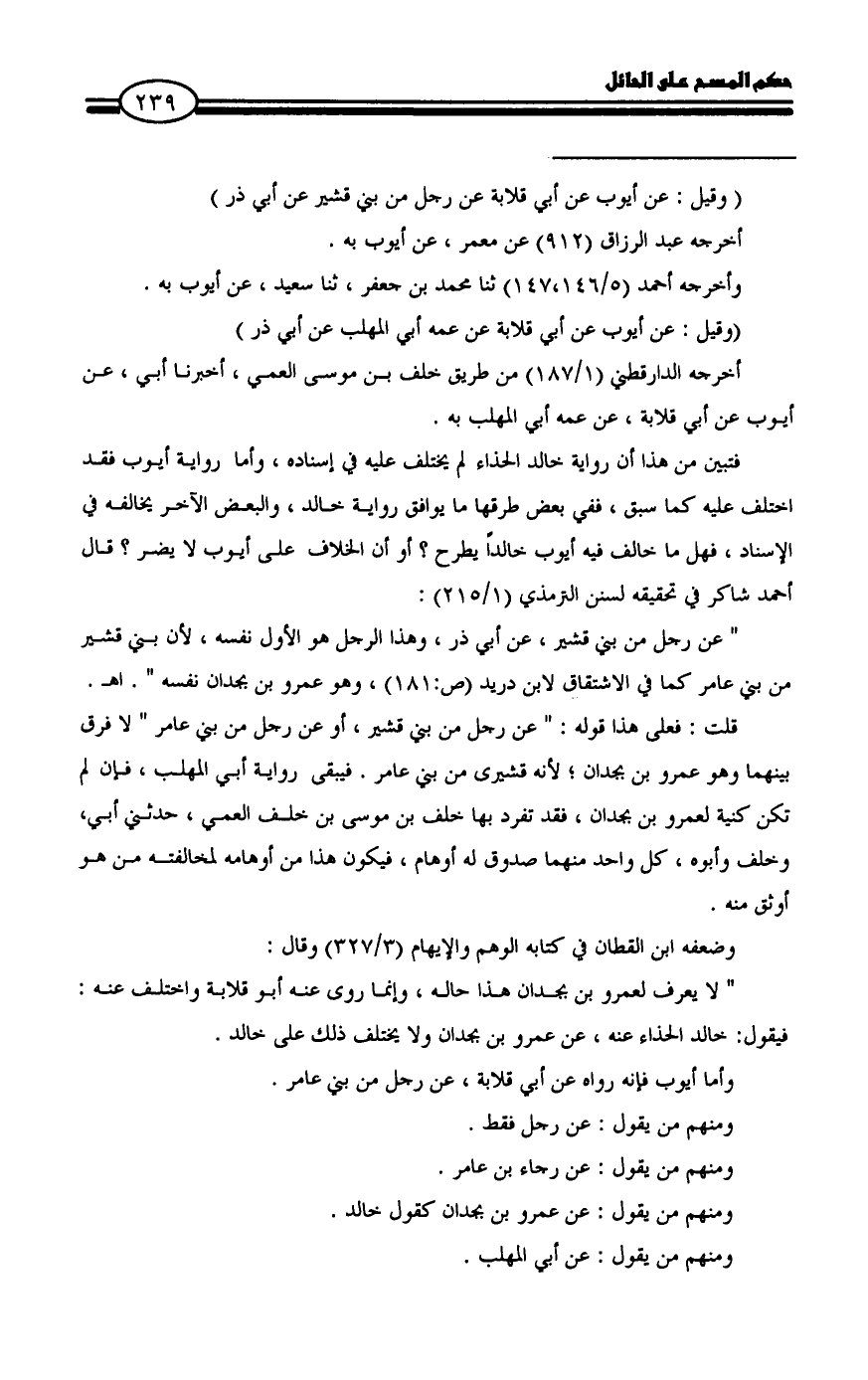قلت: فعلى هذا قوله: " عن رجل من بني قشير، أو عن رجل من بني عامر " لا فرق بينهما وهو عمرو بن بجدان؛ لأنه قشيرى من بني عامر. فيبقى رواية أبي المهلب، فإن لم تكن كنية لعمرو بن بجدان، فقد تفرد بها خلف بن موسى بن خلف العمي، حدثني أبي، وخلف وأبوه، كل واحد منهما صدوق له أوهام، فيكون هذا من أوهامه لمخالفته من هو أوثق منه.