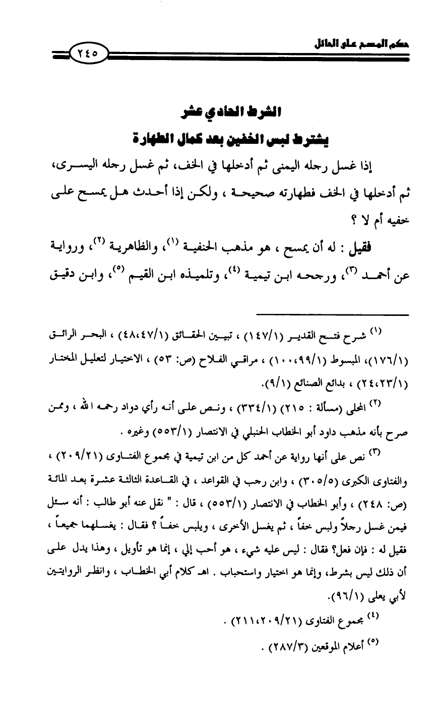 فقيل: له أن يمسح، هو مذهب الحنفية (¬١)، والظاهرية (¬٢)، ورواية عن أحمد (¬٣)، ورجحه ابن تيمية (¬٤)، وتلميذه ابن القيم (¬٥)، وابن دقيق