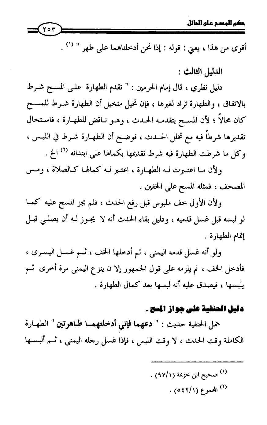 دليل نظري، قال إمام الحرمين: " تقدم الطهارة على المسح شرط بالاتفاق، والطهارة تراد لغيرها، فإن تخيل متخيل أن الطهارة شرط للمسح كان محالاً؛ لأن المسح يتقدمه الحدث، وهو ناقض للطهارة، فاستحال تقديرها شرطاً فيه مع تخلل الحدث، فوضح أن الطهارة شرط في اللبس، وكل ما شرطت الطهارة فيه شرط تقديمها بكمالها على ابتدائه (¬٢) الخ.