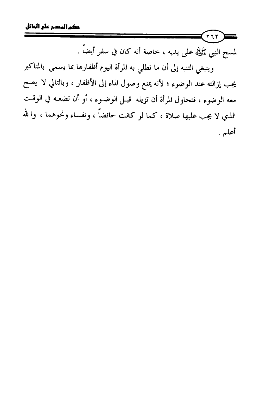 وينبغي التنبه إلى أن ما تطلي به المرأة اليوم أظفارها بما يسمى بالمناكير يجب إزالته عند الوضوء؛ لأنه يمنع وصول الماء إلى الأظفار، وبالتالي لا يصح معه الوضوء، فتحاول المرأة أن تزيله قبل الوضوء، أو أن تضعه في الوقت الذي لا يجب عليها صلاة، كما لو كانت حائضاً، ونفساء ونحوهما، والله أعلم.