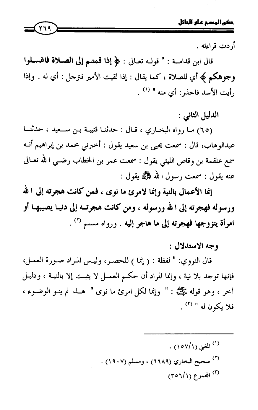 قال النووي: " لفظة: (إنما) للحصر، وليس المراد صورة العمل، فإنها توجد بلا نية، وإنما المراد أن حكم العمل لا يثبت إلا بالنية، ودليل آخر، وهو قوله - صلى الله عليه وسلم -: " وإنما لكل امرئ ما نوى " هذا لم ينو الوضوء، فلا يكون له " (¬٣).