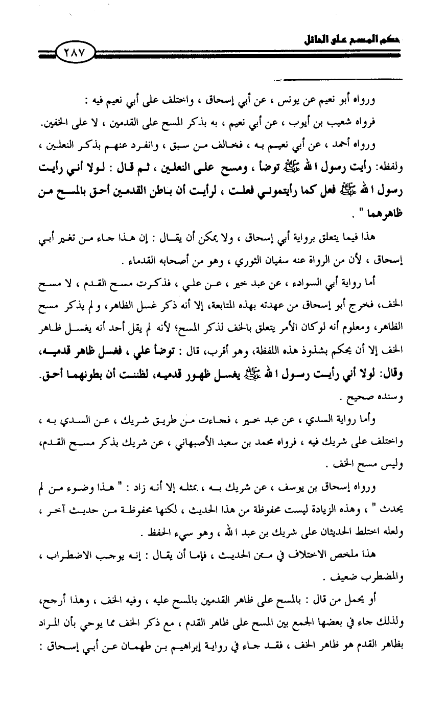 أو يحمل من قال: بالمسح على ظاهر القدمين بالمسح عليه، وفيه الخف، وهذا أرجح، ولذلك جاء في بعضها الجمع بين المسح على ظاهر القدم، مع ذكر الخف مما يوحي بأن المراد بظاهر القدم هو ظاهر الخف، فقد جاء في رواية إبراهيم بن طهمان عن أبي إسحاق: =