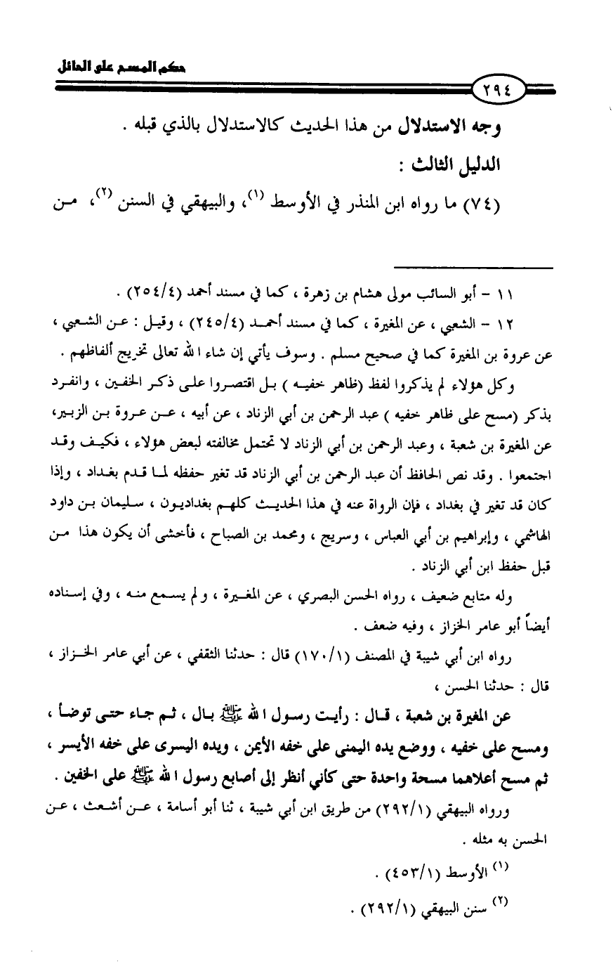 وكل هؤلاء لم يذكروا لفظ (ظاهر خفيه) بل اقتصروا على ذكر الخفين، وانفرد بذكر (مسح على ظاهر خفيه) عبد الرحمن بن أبي الزناد، عن أبيه، عن عروة بن الزبير، عن المغيرة بن شعبة، وعبد الرحمن بن أبي الزناد لا تحتمل مخالفته لبعض هؤلاء، فكيف وقد اجتمعوا. وقد نص الحافظ أن عبد الرحمن بن أبي الزناد قد تغير حفظه لما قدم بغداد، وإذا كان قد تغير في بغداد، فإن الرواة عنه في هذا الحديث كلهم بغداديون، سليمان بن داود الهاشمي، وإبراهيم بن أبي العباس، وسريج، ومحمد بن الصباح، فأخشى أن يكون هذا من قبل حفظ ابن أبي الزناد.