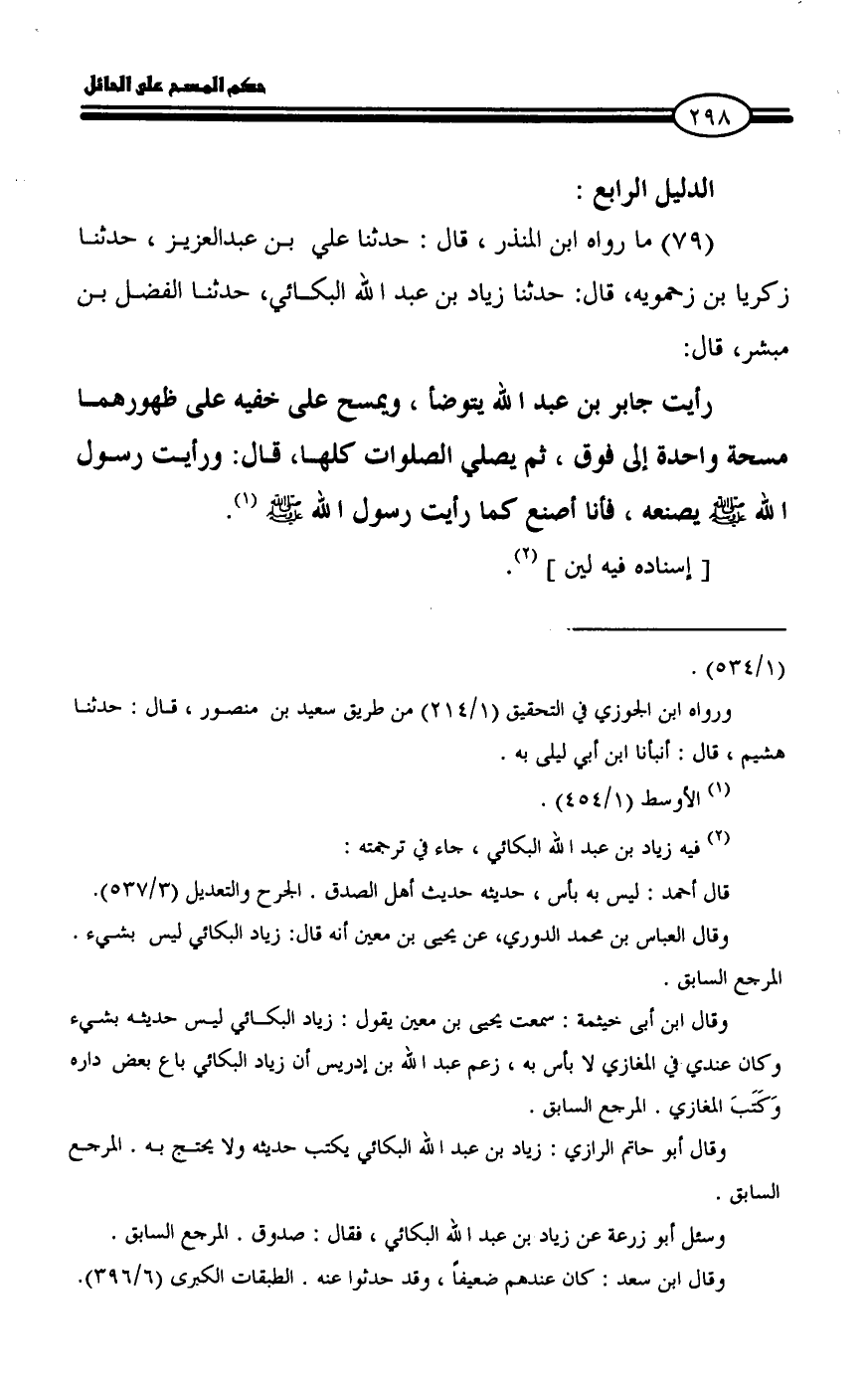 رأيت جابر بن عبد الله يتوضأ، ويمسح على خفيه على ظهورهما مسحة واحدة إلى فوق، ثم يصلي الصلوات كلها، قال: ورأيت رسول الله - صلى الله عليه وسلم - يصنعه، فأنا أصنع كما رأيت رسول الله - صلى الله عليه وسلم - (¬١).