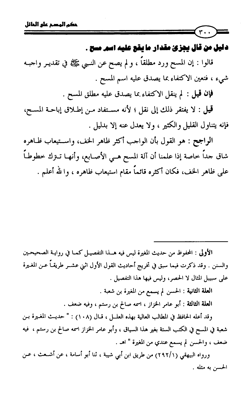 وقد أعله الحافظ في المطالب العالية بهذه العلل، قال (١٠٨): " حديث المغيرة بن شعبة في المسح في الكتب الستة بغير هذا السياق، وأبو عامر الخزاز اسمه صالح بن رستم، فيه ضعف، والحسن لم يسمع عندي من المغيرة " اهـ.