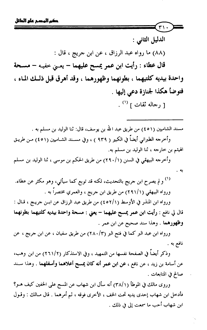 ورواه ابن المنذر في الأوسط (١/ ٤٥٢) من طريق عبد الرزاق عن ابن جريج، قال: قال لي نافع: رأيت ابن عمر يمسح عليهما - يعني: مسحة واحدة بيديه كلتيهما بطونهما وظهورهما. وهذا سند صحيح عن ابن عمر.