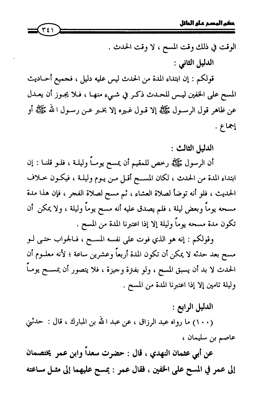 عن أبي عثمان النهدي، قال: حضرت سعداً وابن عمر يختصمان إلى عمر في المسح على الخفين، فقال عمر: يمسح عليهما إلى مثل ساعته