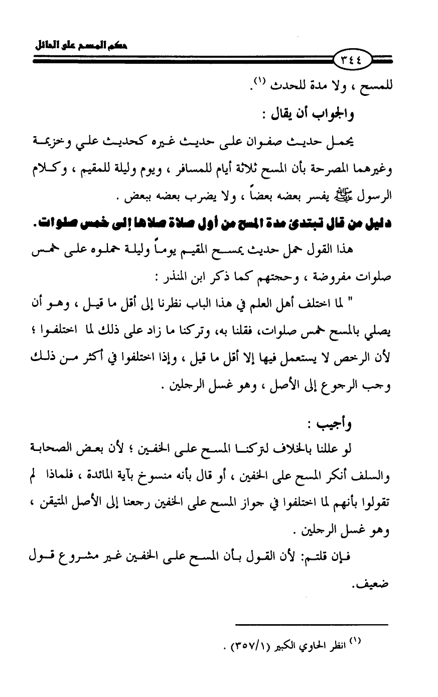 " لما اختلف أهل العلم في هذا الباب نظرنا إلى أقل ما قيل، وهو أن يصلي بالمسح خمس صلوات، فقلنا به، وتركنا ما زاد على ذلك لما اختلفوا؛ لأن الرخص لا يستعمل فيها إلا أقل ما قيل، وإذا اختلفوا في أكثر من ذلك وجب الرجوع إلى الأصل، وهو غسل الرجلين.