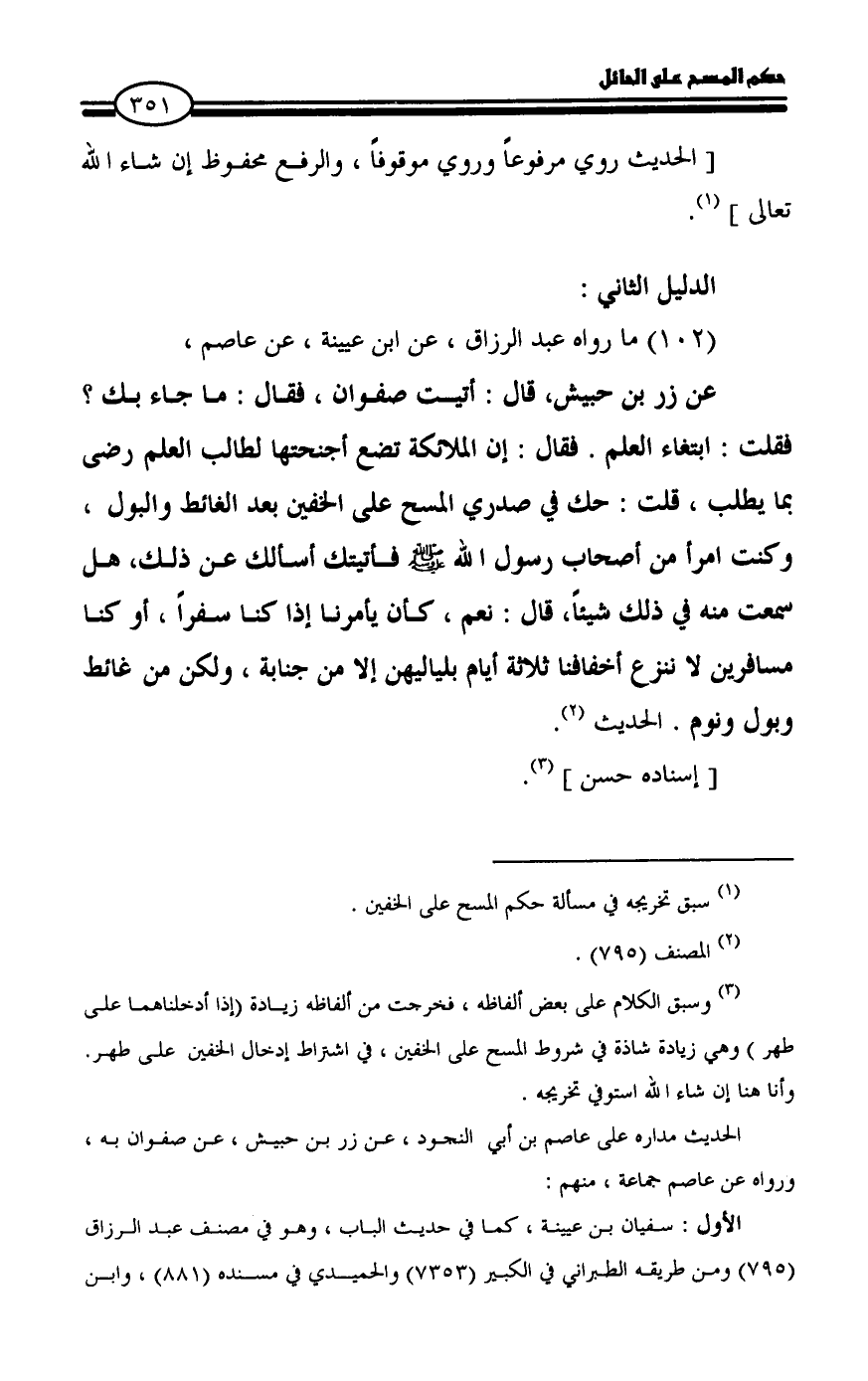 عن زر بن حبيش، قال: أتيت صفوان، فقال: ما جاء بك؟ فقلت: ابتغاء العلم. فقال: إن الملائكة تضع أجنحتها لطالب العلم رضى بما يطلب، قلت: حك في صدري المسح على الخفين بعد الغائط والبول، وكنت امرأ من أصحاب رسول الله - صلى الله عليه وسلم - فأتيتك أسألك عن ذلك، هل سمعت منه في ذلك شيئاً، قال: نعم، كأن يأمرنا إذا كنا سفراً، أو كنا مسافرين لا ننزع أخفافنا ثلاثة أيام بلياليهن إلا من جنابة، ولكن من غائط وبول ونوم. الحديث (¬٢).