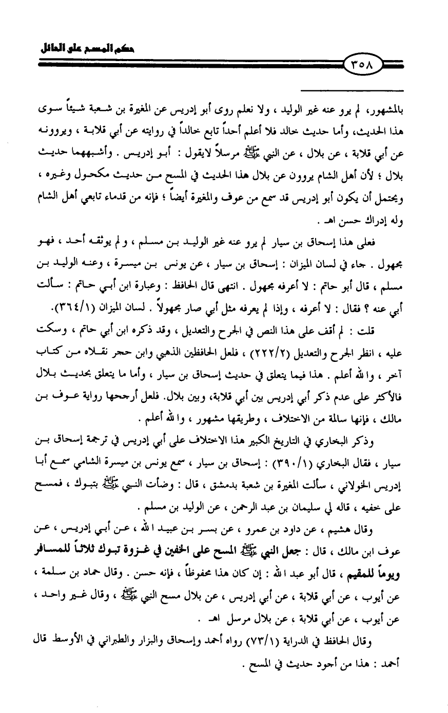 وقال هشيم، عن داود بن عمرو، عن بسر بن عبيد الله، عن أبي إدريس، عن عوف ابن مالك، قال: جعل النبي - صلى الله عليه وسلم - المسح على الخفين في غزوة تبوك ثلاثاً للمسافر ويوماً للمقيم، قال أبو عبد الله: إن كان هذا محفوظاً، فإنه حسن. وقال حماد بن سلمة، عن أيوب، عن أبي قلابة، عن أبي إدريس، عن بلال مسح النبي - صلى الله عليه وسلم -، وقال غير واحد، عن أيوب، عن أبي قلابة، عن بلال مرسل اهـ.