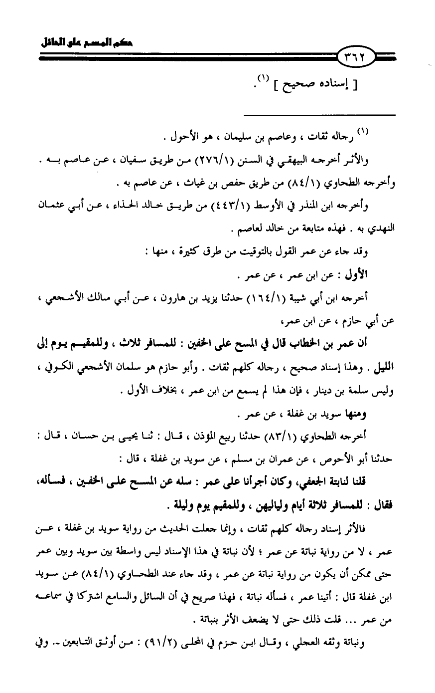 أن عمر بن الخطاب قال في المسح على الخفين: للمسافر ثلاث، وللمقيم يوم إلى الليل. وهذا إسناد صحيح، رجاله كلهم ثقات. وأبو حازم هو سلمان الأشجعي الكوفي، وليس سلمة بن دينار، فإن هذا لم يسمع من ابن عمر، بخلاف الأول.