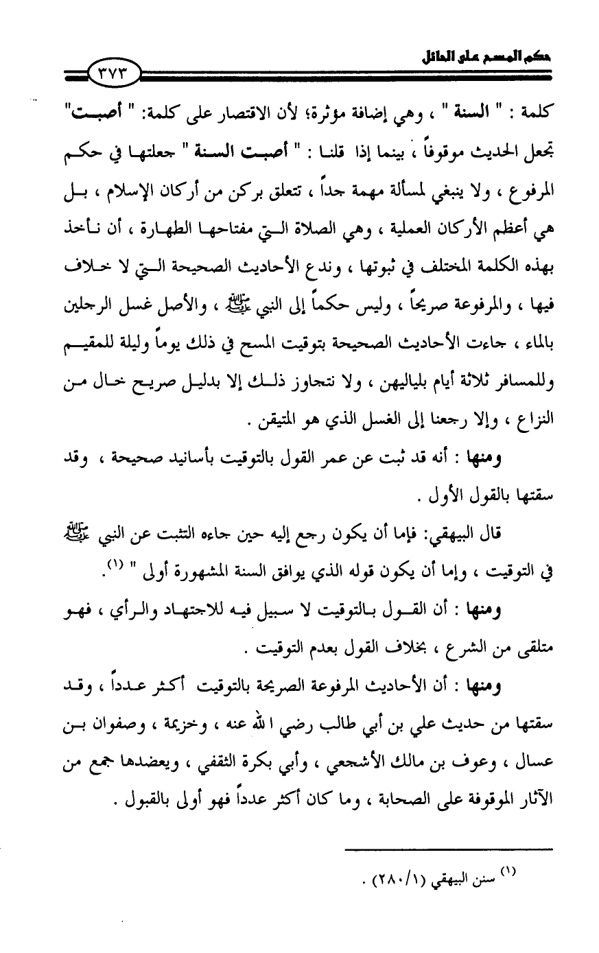 كلمة: " السنة "، وهي إضافة مؤثرة؛ لأن الاقتصار على كلمة: " أصبت" تجعل الحديث موقوفاً، بينما إذا قلنا: " أصبت السنة " جعلتها في حكم المرفوع، ولا ينبغي لمسألة مهمة جداً، تتعلق بركن من أركان الإسلام، بل هي أعظم الأركان العملية، وهي الصلاة التي مفتاحها الطهارة، أن نأخذ بهذه الكلمة المختلف في ثبوتها، وندع الأحاديث الصحيحة التي لا خلاف فيها، والمرفوعة صريحاً، وليس حكماً إلى النبي - صلى الله عليه وسلم -، والأصل غسل الرجلين بالماء، جاءت الأحاديث الصحيحة بتوقيت المسح في ذلك يوماً وليلة للمقيم وللمسافر ثلاثة أيام بلياليهن، ولا نتجاوز ذلك إلا بدليل صريح خال من النزاع، وإلا رجعنا إلى الغسل الذي هو المتيقن.