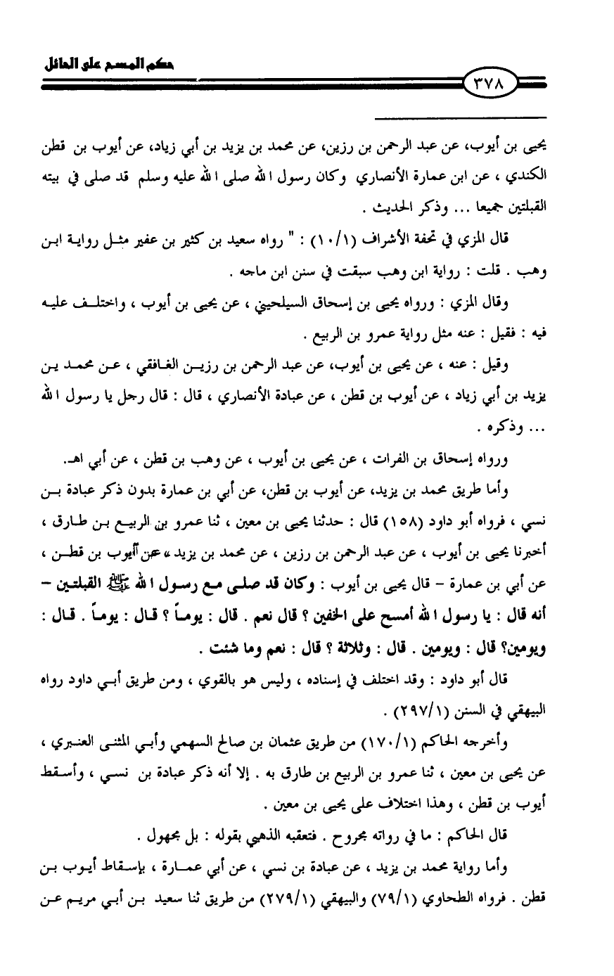 وأما طريق محمد بن يزيد، عن أيوب بن قطن، عن أبي بن عمارة بدون ذكر عبادة بن نسي، فرواه أبو داود (١٥٨) قال: حدثنا يحيى بن معين، ثنا عمرو بن الربيع بن طارق، أخبرنا يحيى بن أيوب، عن عبد الرحمن بن رزين، عن محمد بن يزيد، عن أيوب بن قطن، عن أبي بن عمارة - قال يحيى بن أيوب: وكان قد صلى مع رسول الله - صلى الله عليه وسلم - القبلتين - أنه قال: يا رسول الله أمسح على الخفين؟ قال نعم. قال: يوماً؟ قال: يوماً. قال: ويومين؟ قال: ويومين. قال: وثلاثة؟ قال: نعم وما شئت.