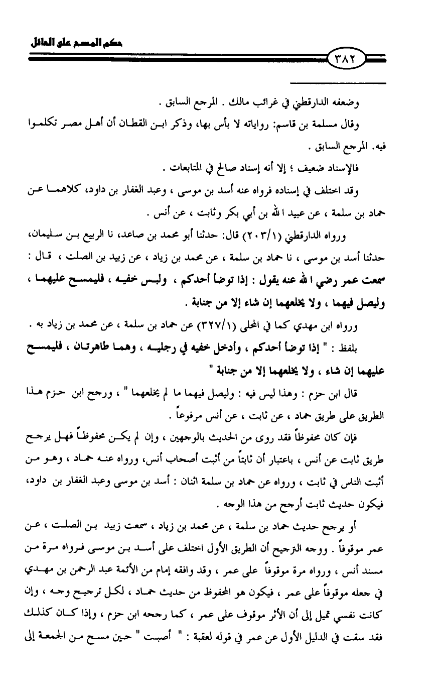 أو يرجح حديث حماد بن سلمة، عن محمد بن زياد، سمعت زبيد بن الصلت، عن عمر موقوفاً. ووجه الترجيح أن الطريق الأول اختلف على أسد بن موسى فرواه مرة من مسند أنس، ورواه مرة موقوفاً على عمر، وقد وافقه إمام من الأئمة عبد الرحمن بن مهدي في جعله موقوفاً على عمر، فيكون هو المحفوظ من حديث حماد، لكل ترجيح وجه، وإن كانت نفسي تميل إلى أن الأثر موقوف على عمر، كما رجحه ابن حزم، وإذا كان كذلك فقد سقت في الدليل الأول عن عمر في قوله لعقبة: " أصبت " حين مسح من الجمعة إلى =