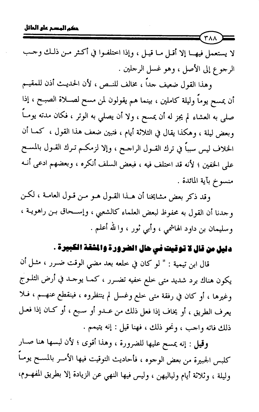 وهذا القول ضعيف جداً، مخالف للنص، لأن الحديث أذن للمقيم أن يمسح يوماً وليلة كاملين، بينما هم يقولون لمن مسح لصلاة الصبح، إذا صلى به العشاء لم يجز له أن يمسح، ولا أن يصلي به الوتر، فكان مدته يوماً وبعض ليلة، وهكذا يقال في الثلاثة أيام، فتبين ضعف هذا القول، كما أن الخلاف ليس سبباً في ترك القول الراجح، وإلا لزمكم ترك القول بالمسح على الخفين؛ لأنه قد اختلف فيه، فبعض السلف أنكره، وبعضهم ادعى أنه منسوخ بآية المائدة.