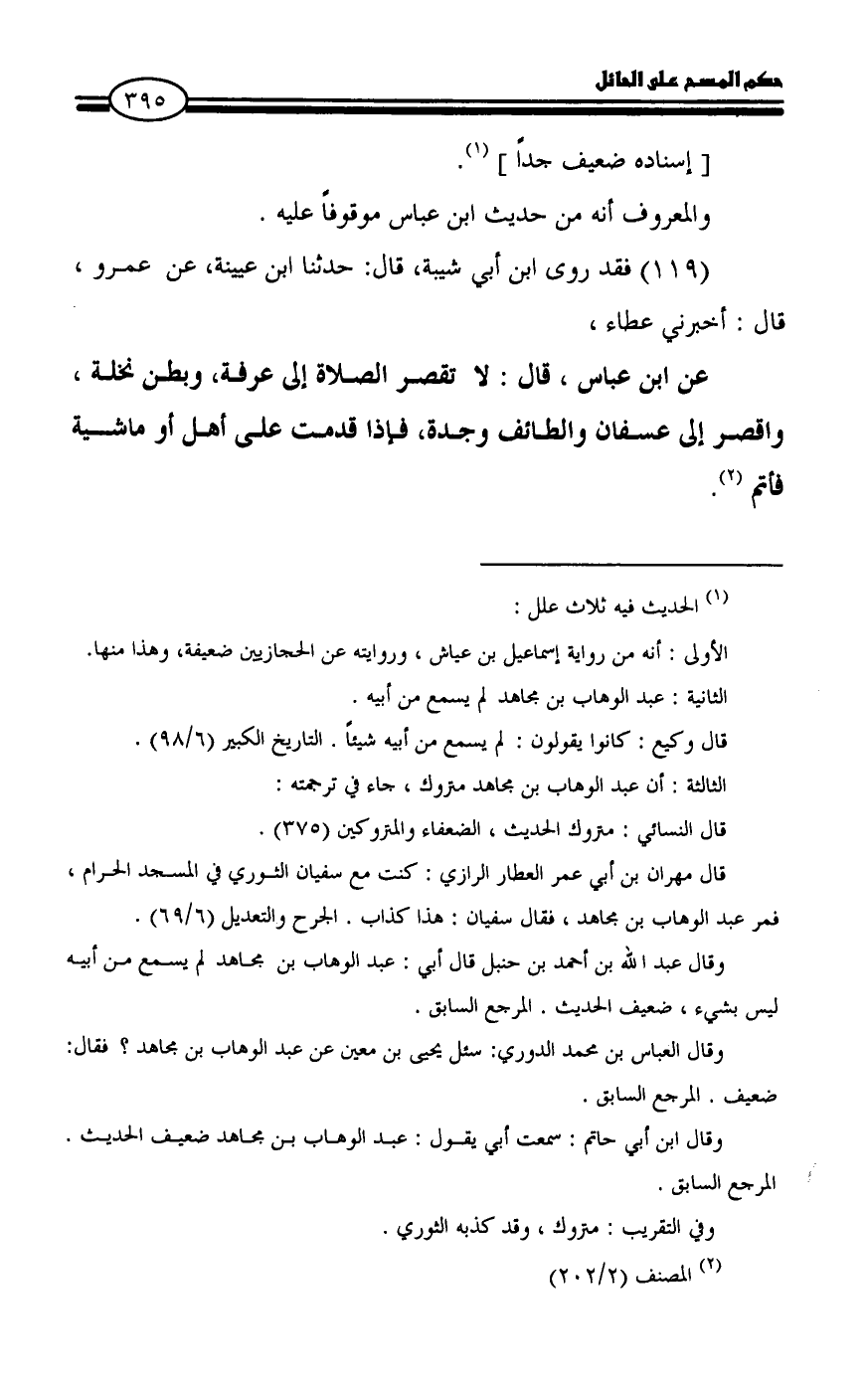 عن ابن عباس، قال: لا تقصر الصلاة إلى عرفة، وبطن نخلة، واقصر إلى عسفان والطائف وجدة، فإذا قدمت على أهل أو ماشية