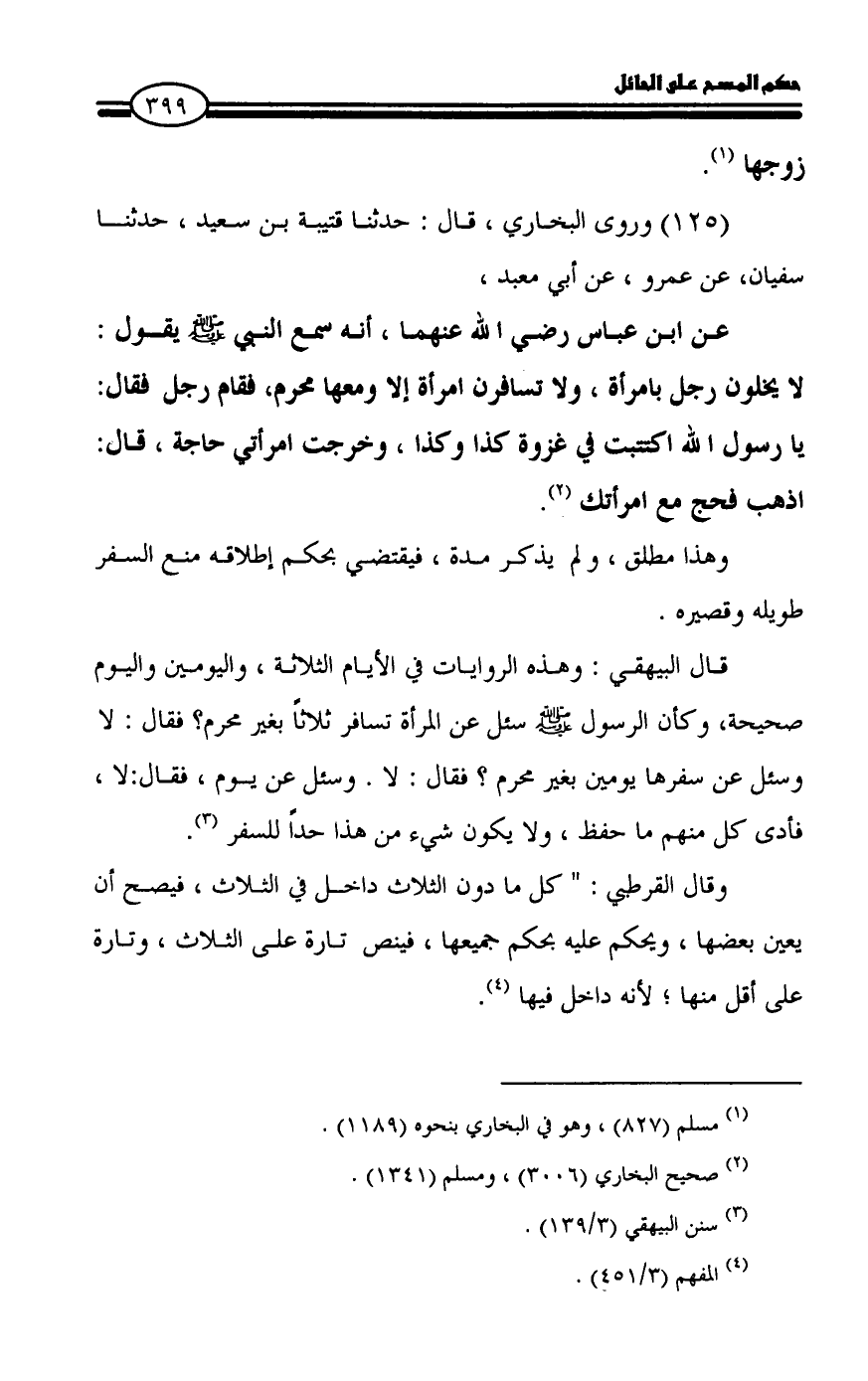 قال البيهقي: وهذه الروايات في الأيام الثلاثة، واليومين واليوم صحيحة، وكأن الرسول - صلى الله عليه وسلم - سئل عن المرأة تسافر ثلاثاً بغير محرم؟ فقال: لا وسئل عن سفرها يومين بغير محرم؟ فقال: لا. وسئل عن يوم، فقال: لا، فأدى كل منهم ما حفظ، ولا يكون شيء من هذا حداً للسفر (¬٣).