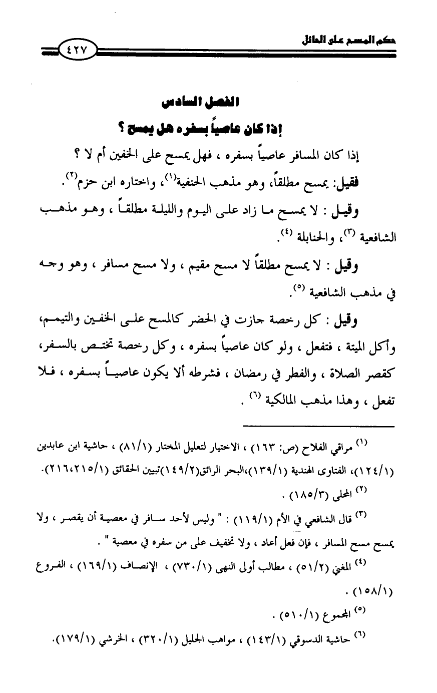 (¬٣) قال الشافعي في الأم (١/ ١١٩): " وليس لأحد سافر في معصية أن يقصر، ولا يمسح مسح المسافر، فإن فعل أعاد، ولا تخفيف على من سفره في معصية ".