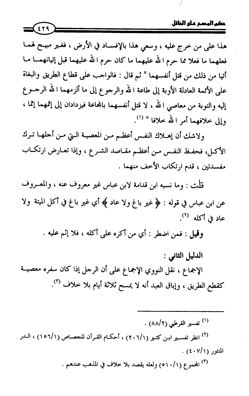 قلت: وما نسبه ابن قدامة لابن عباس غير معروف عنه، والمعروف عن ابن عباس في قوله: {غير باغ ولا عاد} أي غير باغ في أكل الميتة ولا عاد في أكله (¬٢).