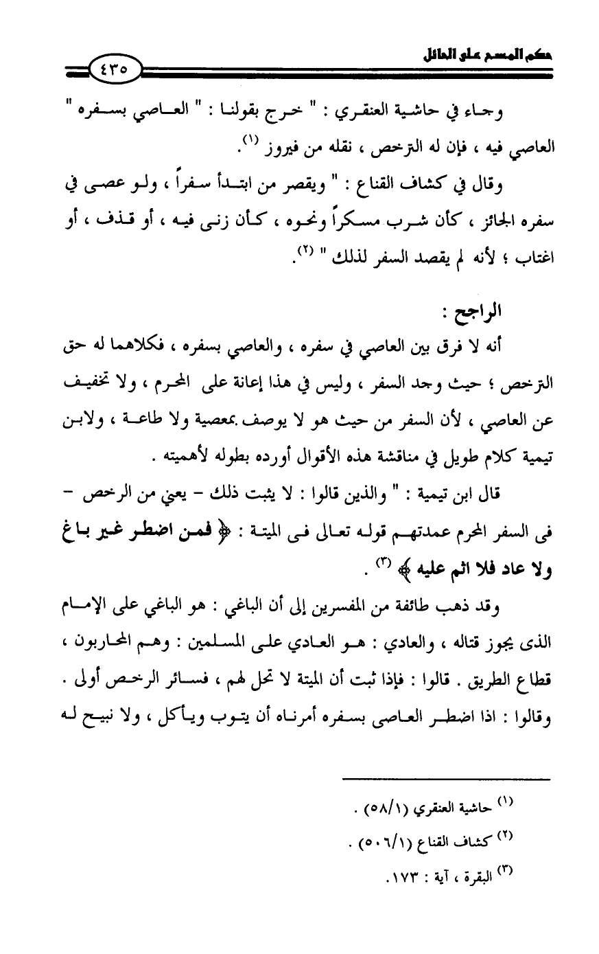 أنه لا فرق بين العاصي في سفره، والعاصي بسفره، فكلاهما له حق الترخص؛ حيث وجد السفر، وليس في هذا إعانة على المحرم، ولا تخفيف عن العاصي، لأن السفر من حيث هو لا يوصف بمعصية ولا طاعة، ولابن تيمية كلام طويل في مناقشة هذه الأقوال أورده بطوله لأهميته.