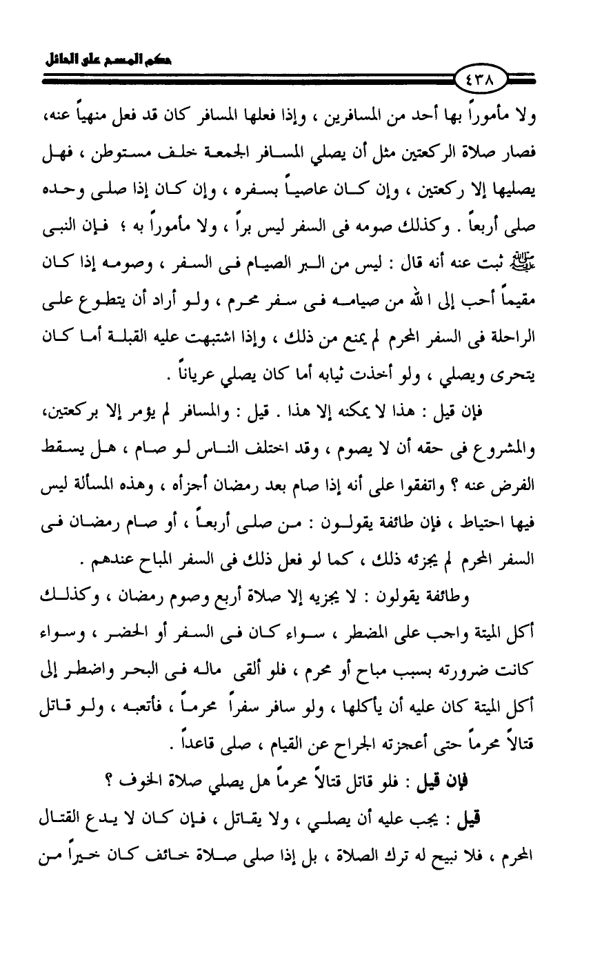 ولا مأموراً بها أحد من المسافرين، وإذا فعلها المسافر كان قد فعل منهياً عنه، فصار صلاة الركعتين مثل أن يصلي المسافر الجمعة خلف مستوطن، فهل يصليها إلا ركعتين، وإن كان عاصياً بسفره، وإن كان إذا صلى وحده صلى أربعاً. وكذلك صومه فى السفر ليس براً، ولا مأموراً به؛ فإن النبى - صلى الله عليه وسلم - ثبت عنه أنه قال: ليس من البر الصيام فى السفر، وصومه إذا كان مقيماً أحب إلى الله من صيامه فى سفر محرم، ولو أراد أن يتطوع على الراحلة فى السفر المحرم لم يمنع من ذلك، وإذا اشتبهت عليه القبلة أما كان يتحرى ويصلي، ولو أخذت ثيابه أما كان يصلي عرياناً.