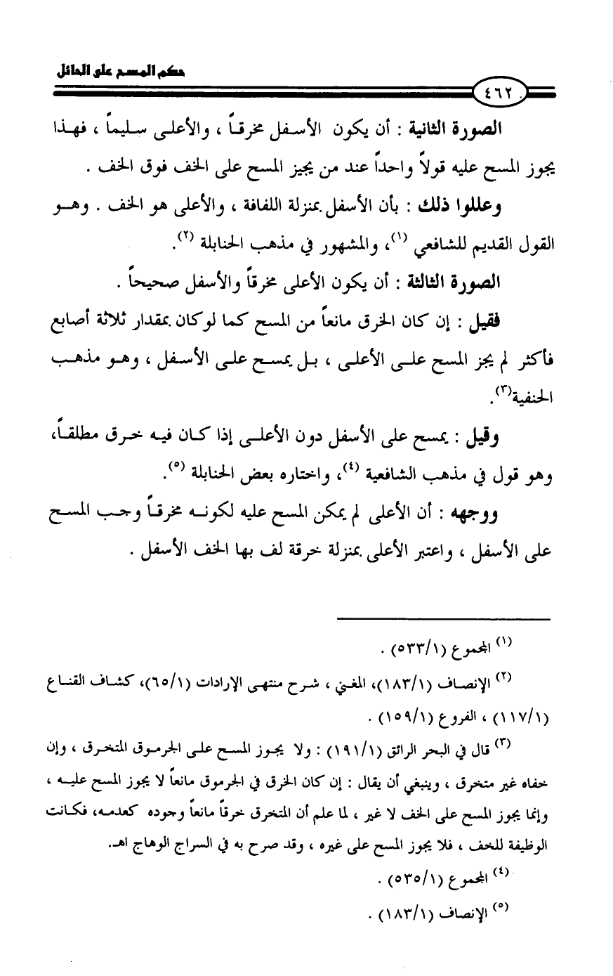 (¬٣) قال في البحر الرائق (١/ ١٩١): ولا يجوز المسح على الجرموق المتخرق، وإن خفاه غير متخرق، وينبغي أن يقال: إن كان الخرق في الجرموق مانعاً لا يجوز المسح عليه، وإنما يجوز المسح على الخف لا غير، لما علم أن المتخرق خرقاً مانعاً وجوده كعدمه، فكانت الوظيفة للخف، فلا يجوز المسح على غيره، وقد صرح به في السراج الوهاج اهـ.
