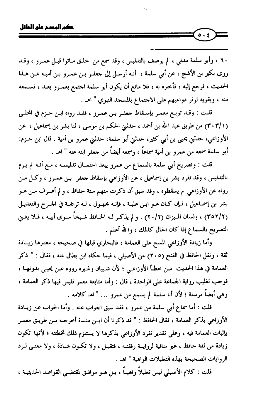 وأما زيادة الأوزاعي المسح على العمامة، فالبخاري قبلها في صحيحه، معتبرها زيادة ثقة، ونقل الحافظ في الفتح (٢٠٥) عن الأصيلي، فيما حكاه ابن بطال عنه، فقال: " ذكر العمامة في هذا الحديث من خطأ الأوزاعي؛ لأن شيبان وغيره رووه عن يحيى بدونها، فوجب تغليب رواية الجماعة على الواحدة، قال: وأما متابعة معمر فليس فيها ذكر العمامة، وهي أيضاً مرسلة؛ لأن أبا سلمة لم يسمع من عمرو ... " اهـ كلامه.