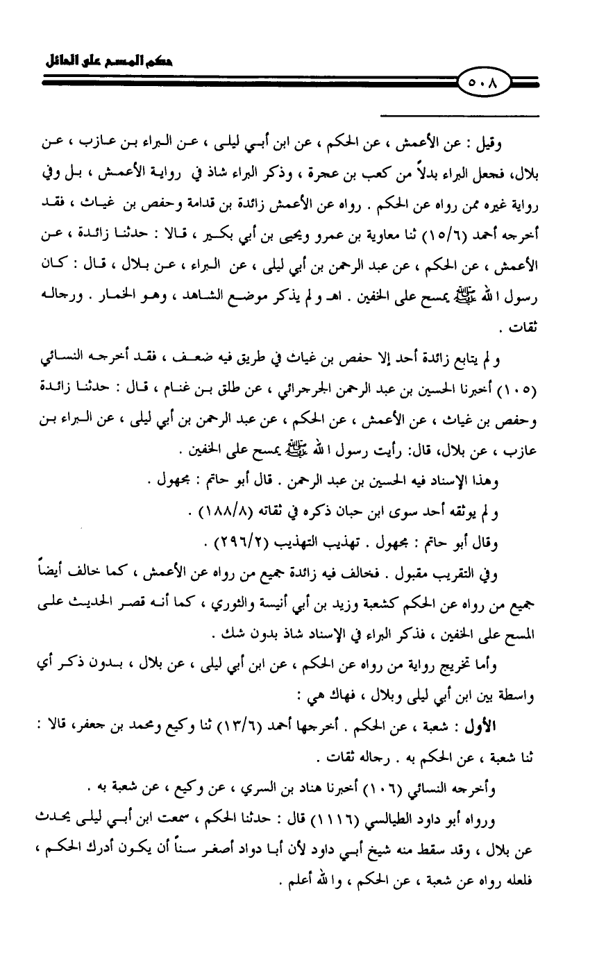 وفي التقريب مقبول. فخالف فيه زائدة جميع من رواه عن الأعمش، كما خالف أيضاً جميع من رواه عن الحكم كشعبة وزيد بن أبي أنيسة والثوري، كما أنه قصر الحديث على المسح على الخفين، فذكر البراء في الإسناد شاذ بدون شك.